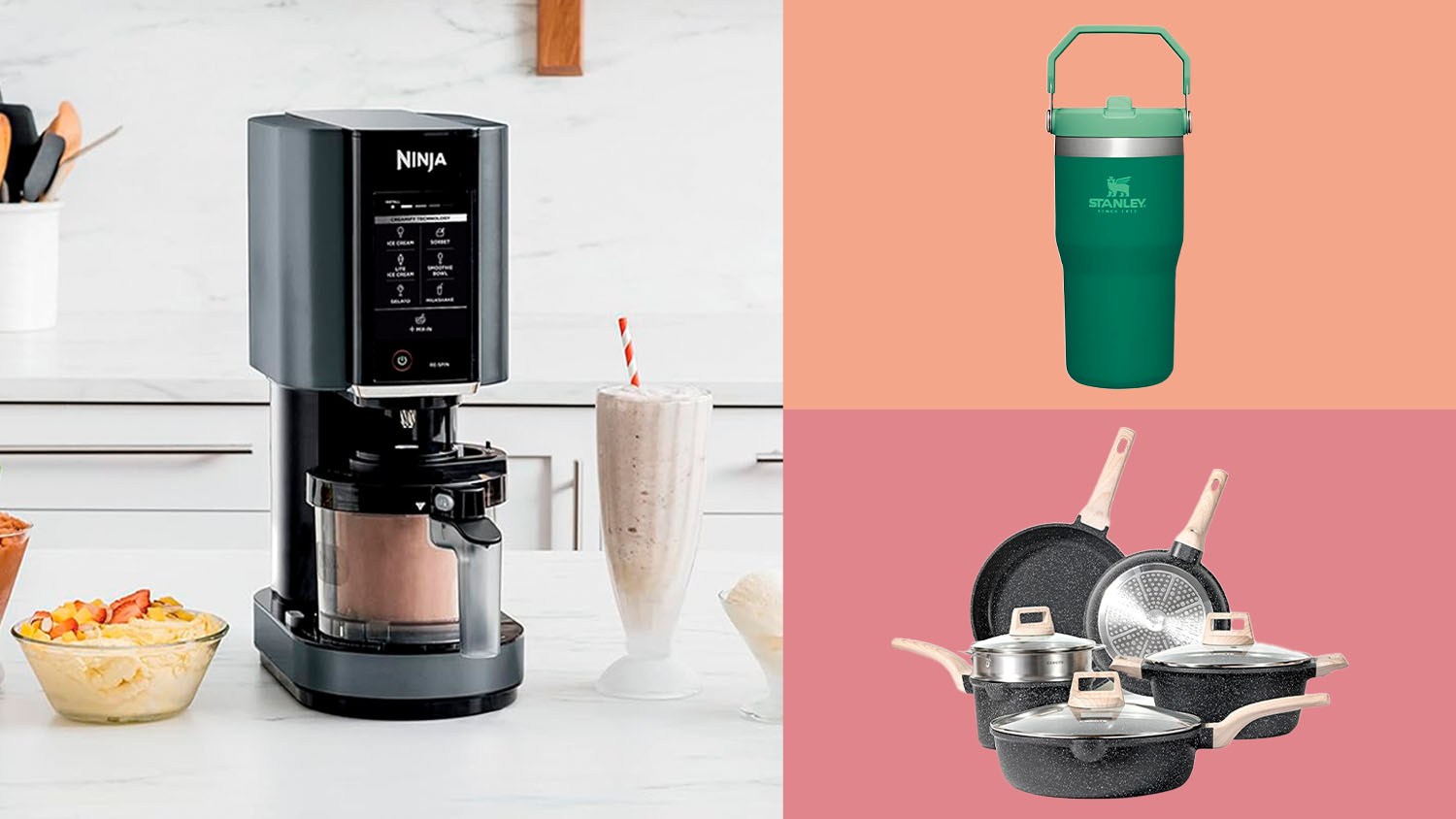 Shop this article: Stanley Quencher H2.0 FlowState Stainless Steel Vacuum Insulated Tumbler, FARBERWARE Build-a-Board Cutting Board with Compartments and Clear Locking Lid, Ninja CREAMi Ice Cream Maker