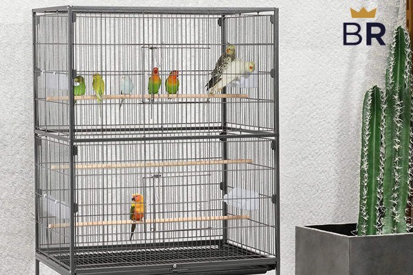 This large and sturdy cage is easy to assemble, moves smoothly, keeps your birds safe, and provides them with room to play and fly.