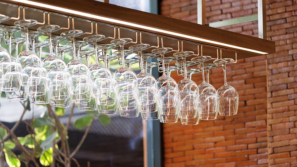 Many wine glass racks double as storage for your wine bottles. Keeping all of your wine accessories in the same place makes storage and organization all the easier.