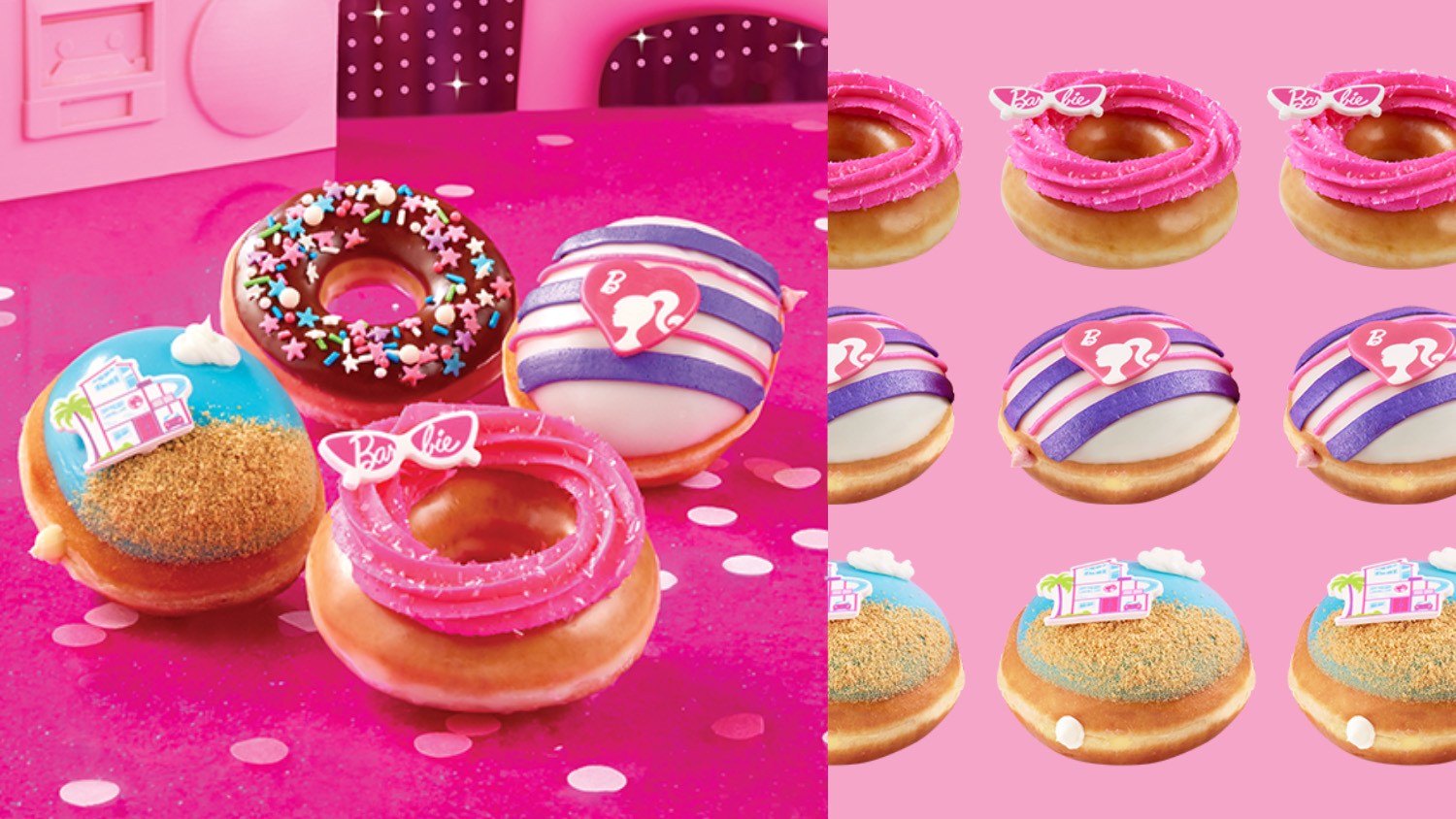 And the Barbie Pink Doughnut is an Original Glazed Doughnut piped with pink buttercream, topped with sparkling pink sugar and a candy pair of Barbie's iconic cat-eye sunglasses.